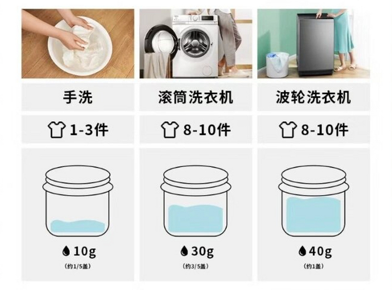 正确做法:严格按照洗涤剂包装上的说明用量添加——比如洗衣液按衣物重量、水量添加,洗洁精按碗碟数量添加,脏污较重时,可适当增加用量,但最多不超过说明用量的1.5倍。