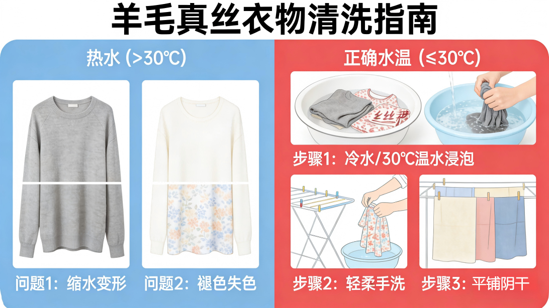 • 精致衣物:羊毛、真丝等材质的衣物,热水会导致衣物缩水、变形、褪色,只能用冷水或30℃以下的温水清洗;