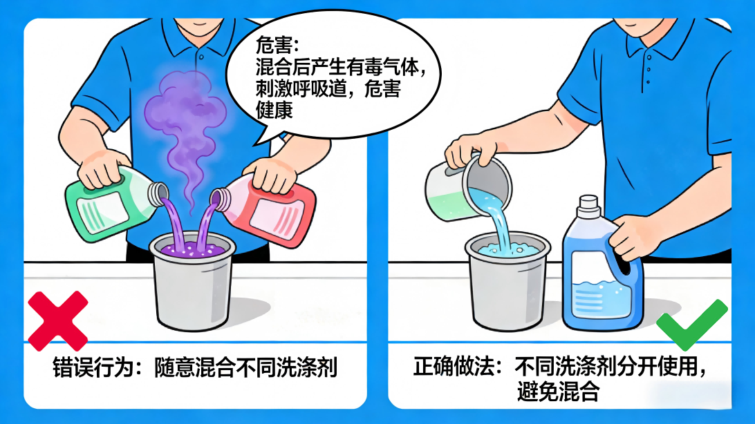 正确做法:不同类型的洗涤剂,分开使用,不要随意混合;使用时,保持环境通风,避免长时间接触皮肤和呼吸道。