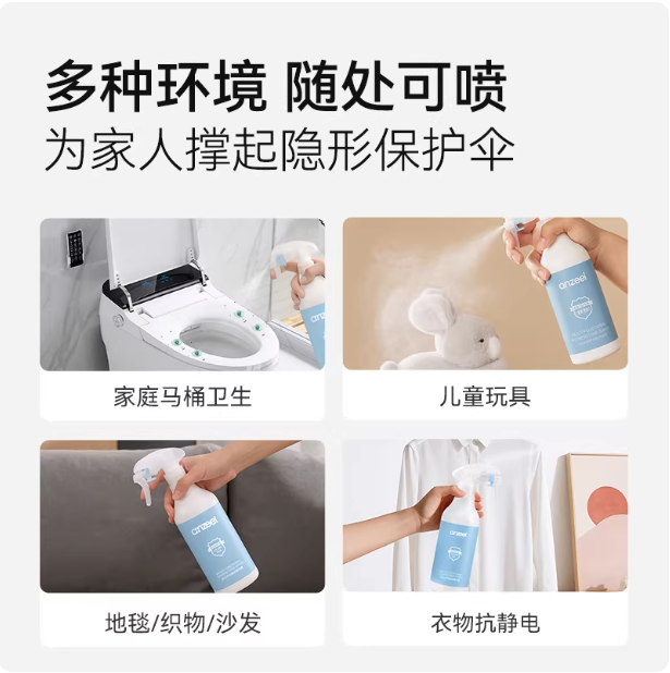 室内、车内空间除菌,宠物用品、儿童玩具、沙发、地毯、织物等多种家居物品表面。